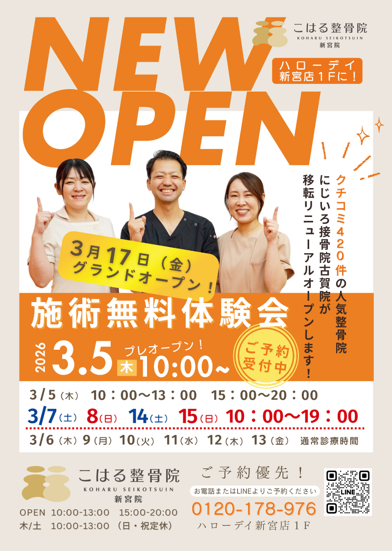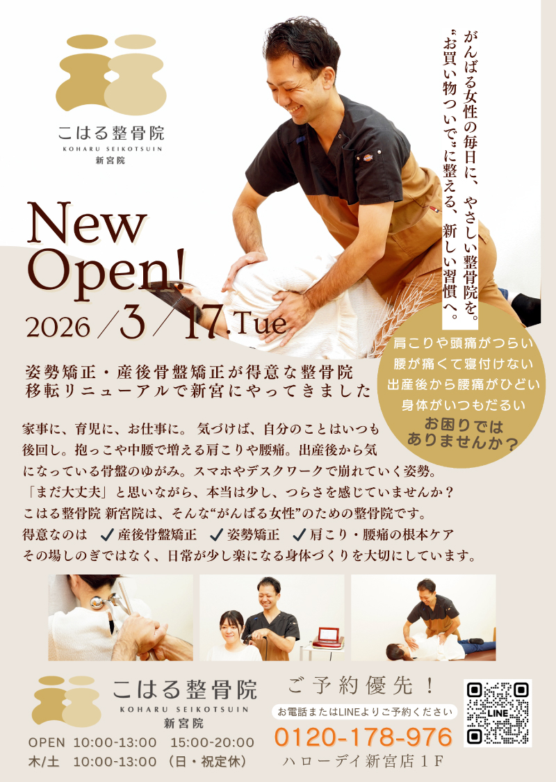 「産後骨盤矯正」「姿勢改善」「交通事故施術」の整骨院をお探しの方は、ハローデイ新宮店1階の《こはる整骨院 新宮院》へお気軽にご相談ください。